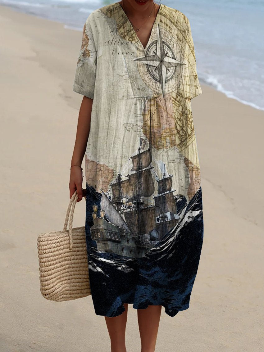 Large Ship Sailing On The Sea Decorative Pattern Flowy Dress
