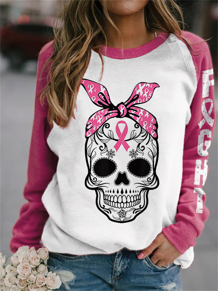 Pink Ribbon Sugar Skull Print Contrast Sweatshirt