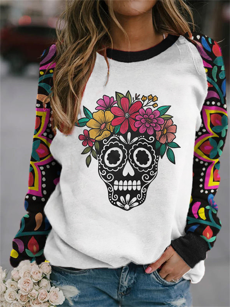 Sugar Skull Mexican Flowers Patchwork Sweatshirt