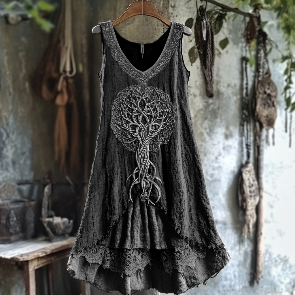 Tribal Tree Of Life Lace Patchwork Art Linen Tank Dress