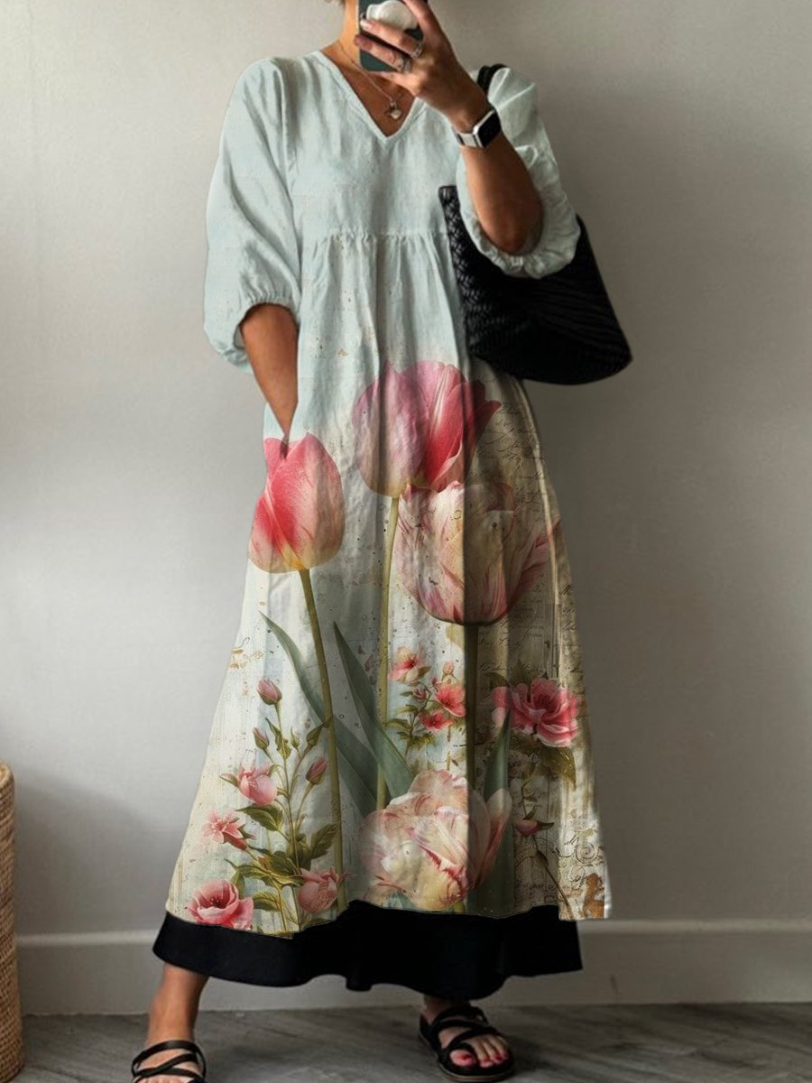 Tulip Floral Print Pocket V-neck Cotton Dress
