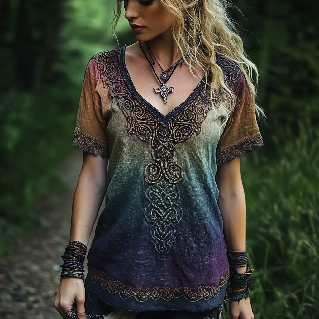 Viking Celtic Knot Embroidery Gradient Art Vintage Linen T Shirt