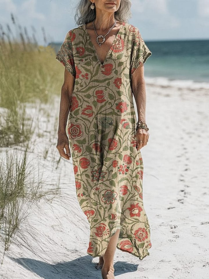 Vintage Floral Pattern Printed Women's Pocket Cotton Dress