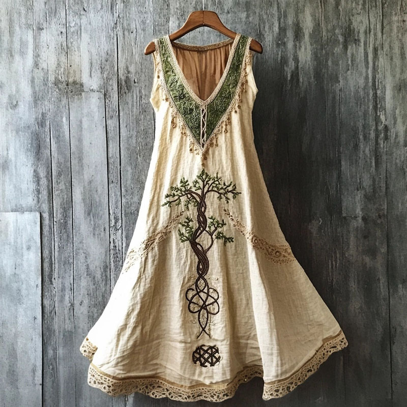 Vintage Viking Tree Of Life Embroidered V Neck Cozy Linen Dress