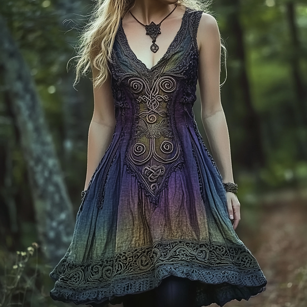 Vintage Viking Tree Of Life Gradient Art Linen Women's Waist Short Midi Dress