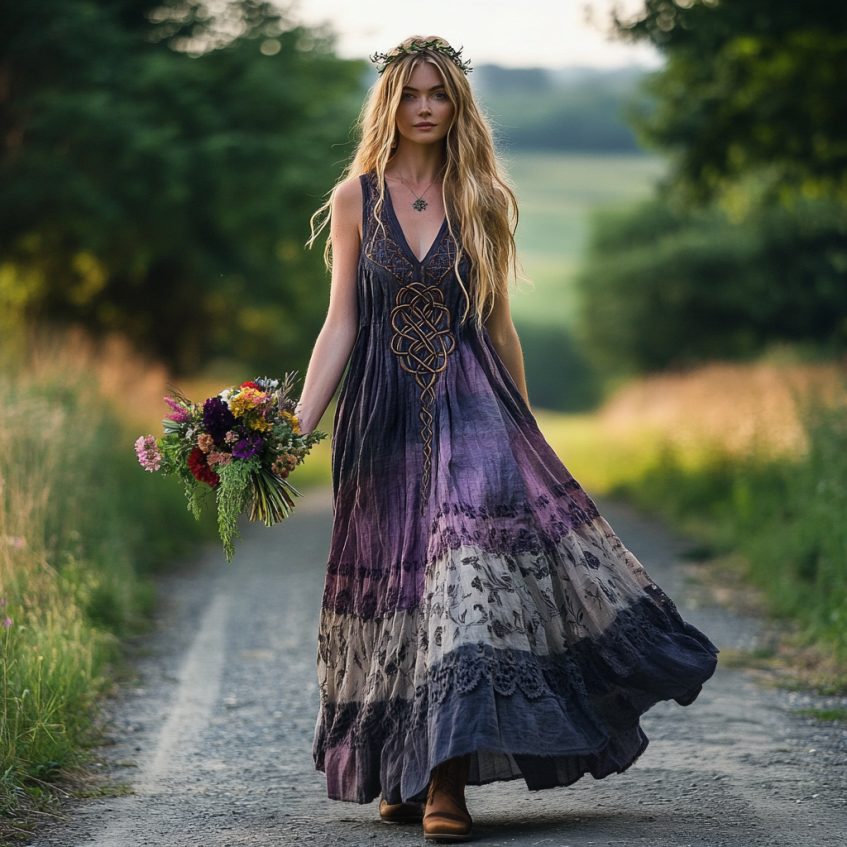 Vintage Viking Tribal Celtic Knot Embroidery Gradient Art Linen Tank Dress