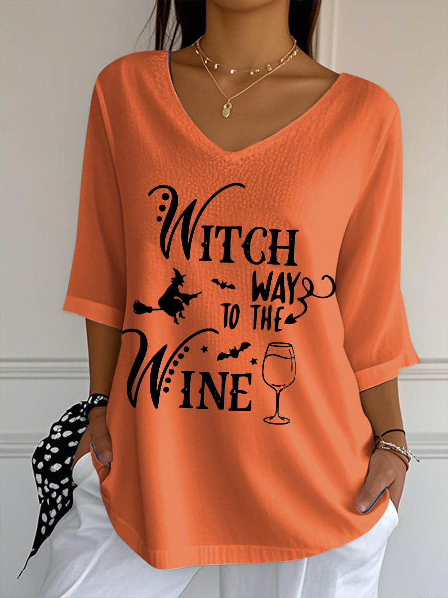 Women’s Witch Way To The Wine Printed V-Neck Top