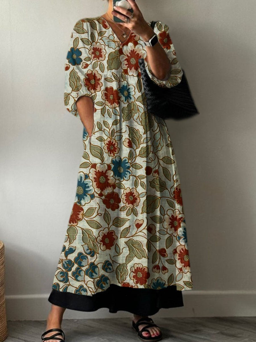 Women's Boho Retro Print Pocket V-neck Cotton Dress