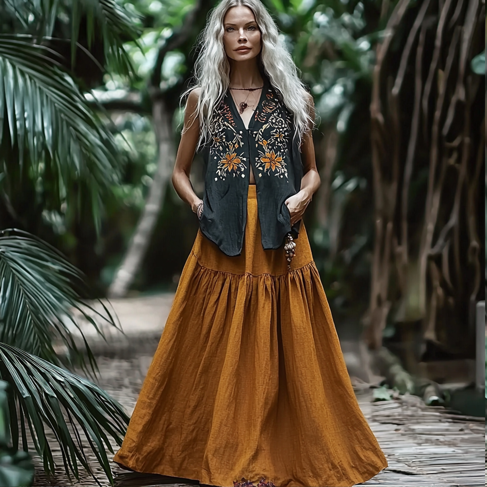 Women's Elegant Ethnic Floral Sleeveless Linen Maxi Dress