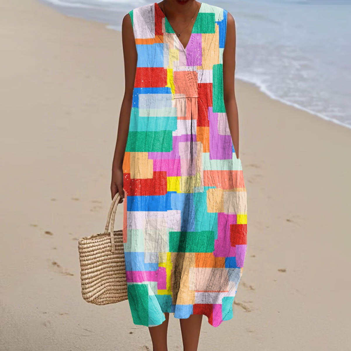 Women's Fashion Color Block Art Print Sleeveless Cotton Pocket Wrap V Neck Dress
