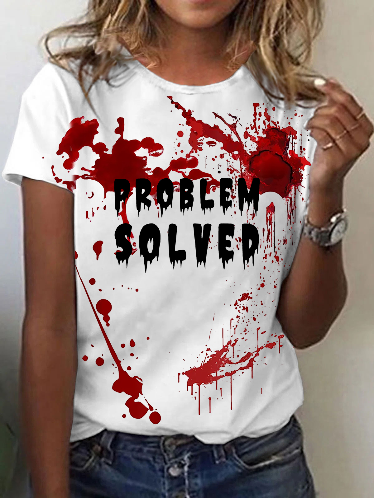 Women's Funny PROBLEM SOLVED Bloodstained Print Casual Short Sleeve Tee