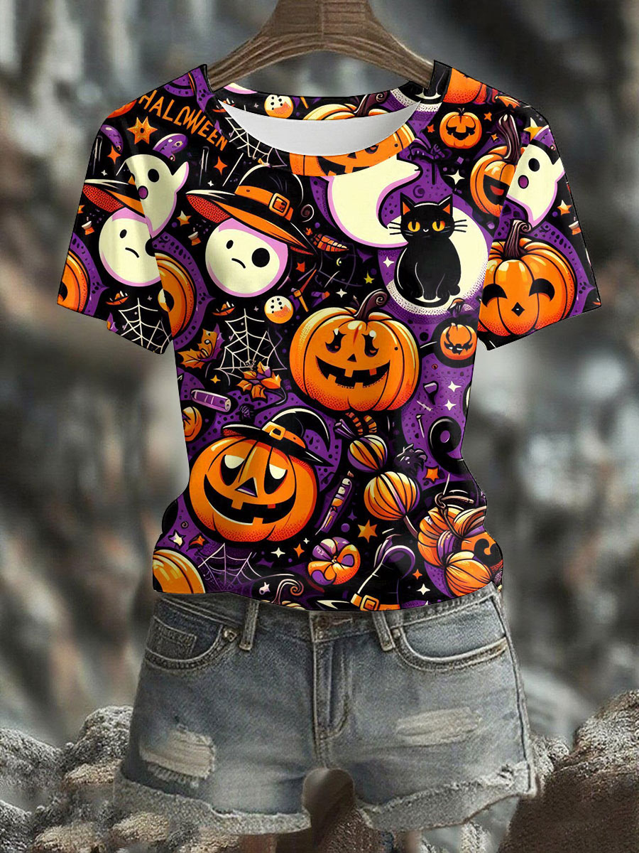 Women's Halloween Black Cat Printed T-shirt