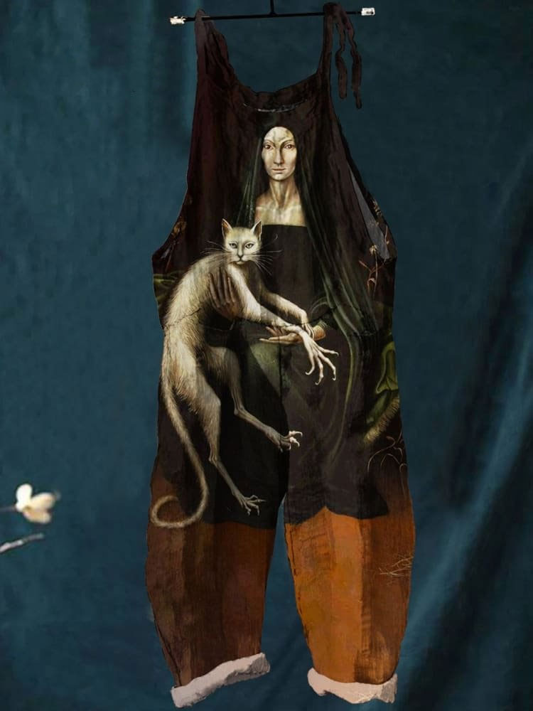 Women's Halloween Cat Art Print Casual 100% Cotton Wide Leg Jumpsuit