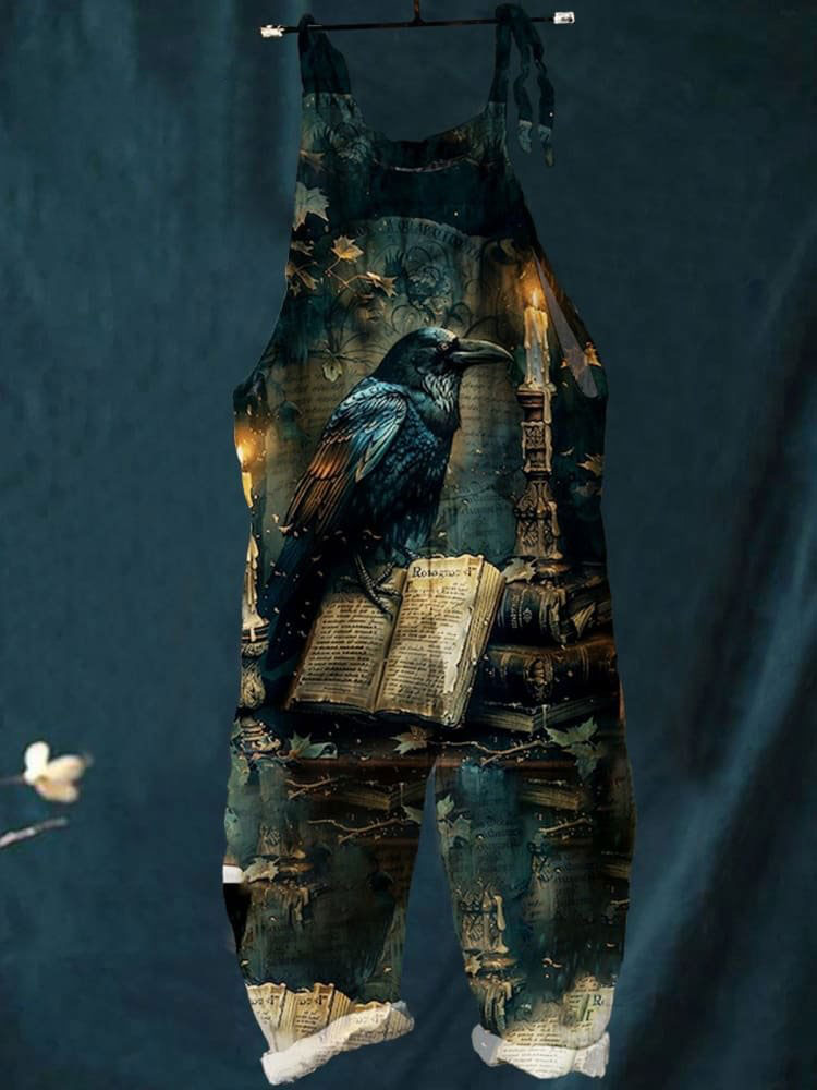 Women's Halloween Crow Art Print Casual 100% Cotton Wide Leg Jumpsuit