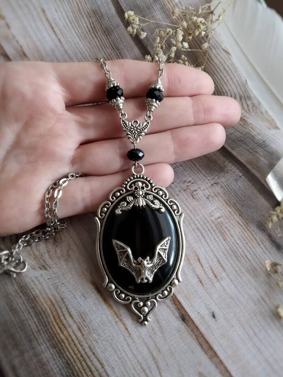 Women's Halloween Gothic Bat Spider Black Gemstone Necklace