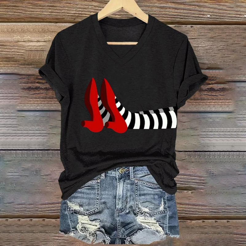 Women's Halloween Red Shoes Print V-Neck T-Shirt