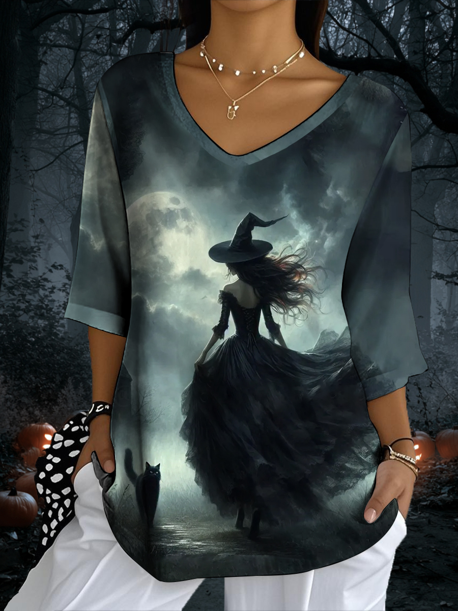 Women's Halloween Vintage Witch And Black Cat Printed V-Neck Top