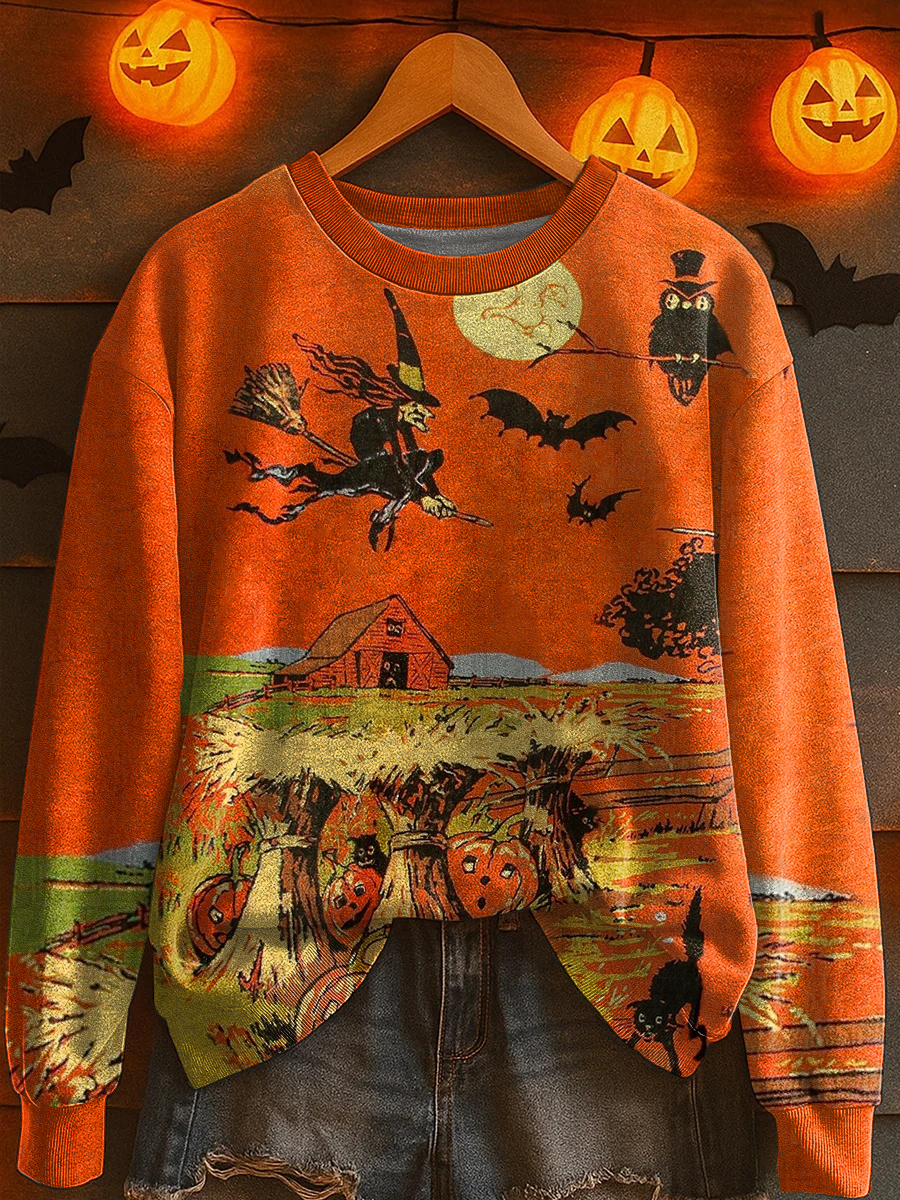Women's Halloween Vintage Witch Pumpkins And Black Cat Printed V-Neck TopSweatshirt
