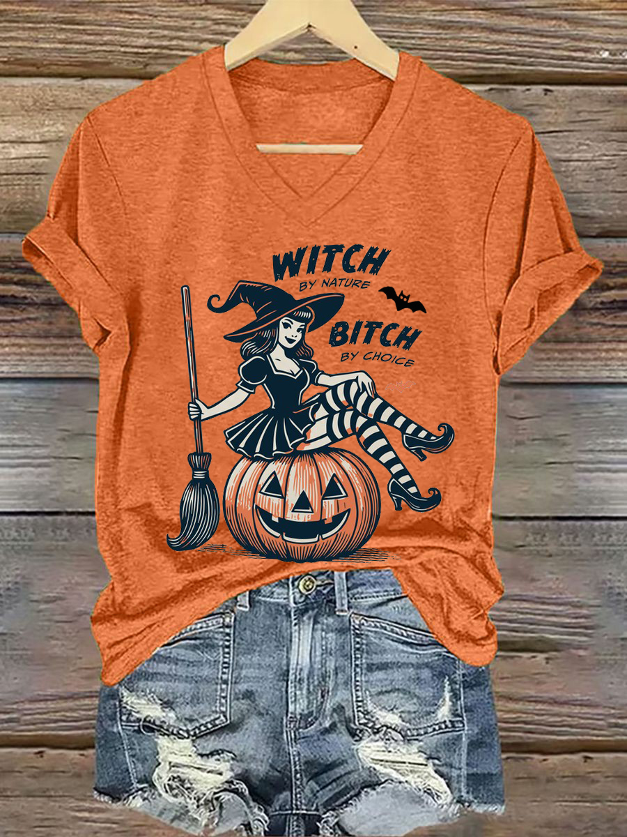 Women's Halloween Witch By Nature Birch By Choice Printed V-neck T-shirt