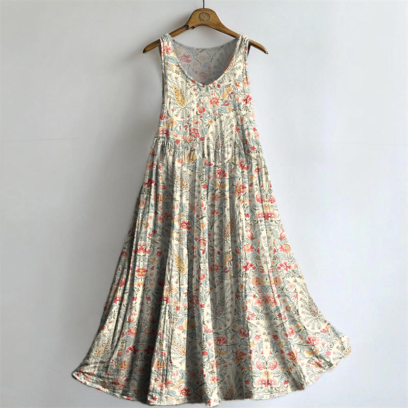 Women's Retro Paisley Floral Art Print Sleeveless Cotton Pocket Dress