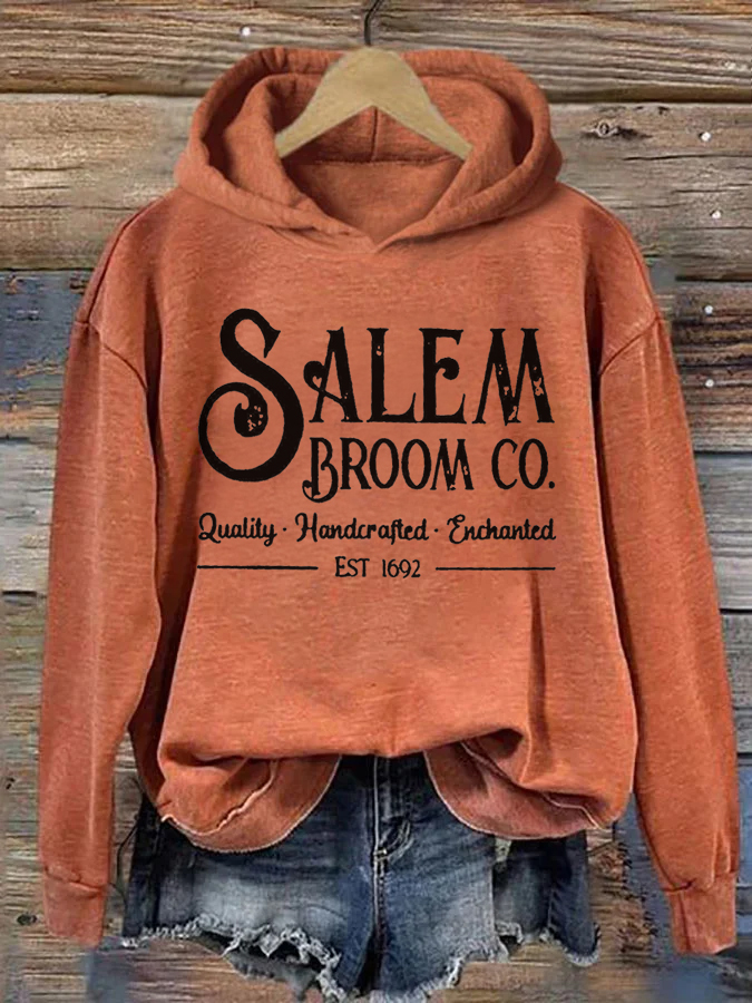Women's Salem Broom Co Quality Handcrafted Enchanted Est 1692 Printed Round Neck Long Sleeve Hoodie