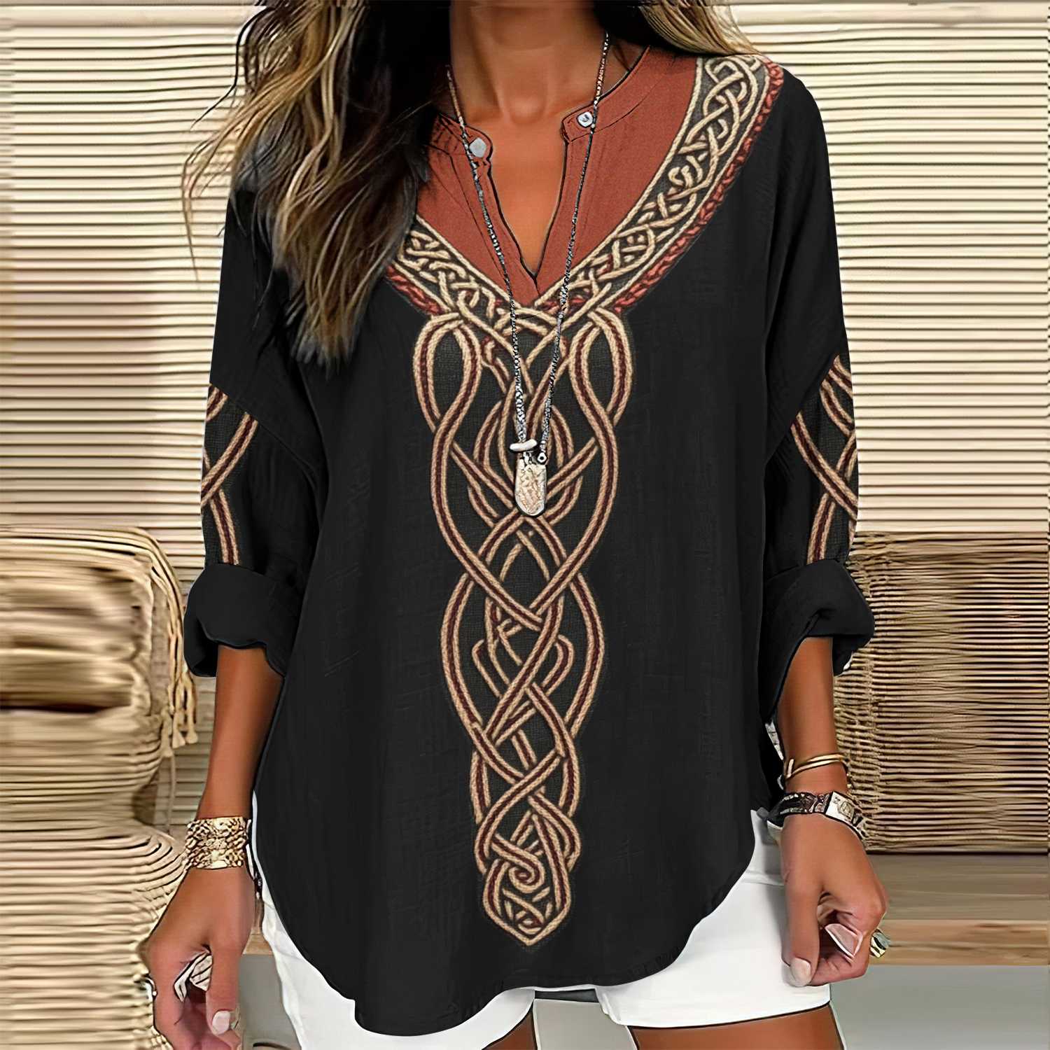 Women's Viking Celtic Knot Art Linen Print Casual Shirt