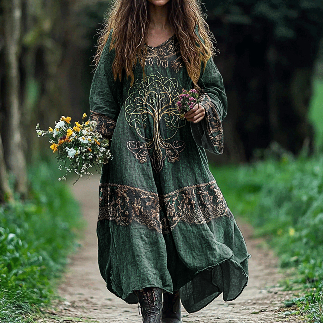 Women's Viking Celtic Tree Of Life Rune Embroidered Linen Dress