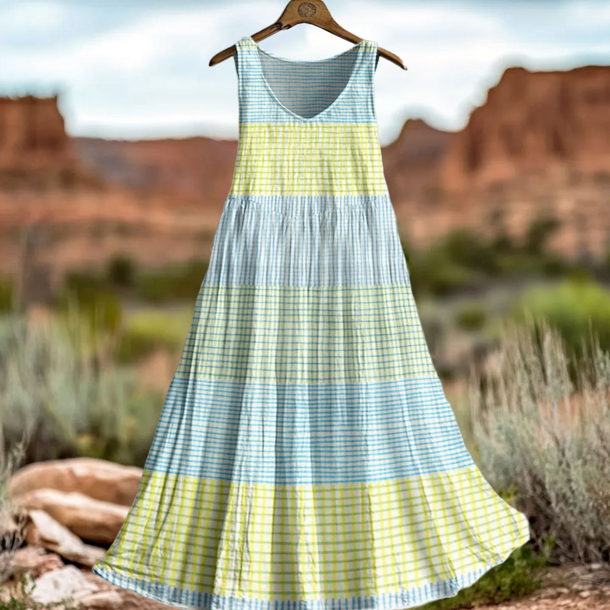 Women's Vintage Abstract Geometric Lines Art Print Crew Neck Sleeveless Cotton Pocket Dress