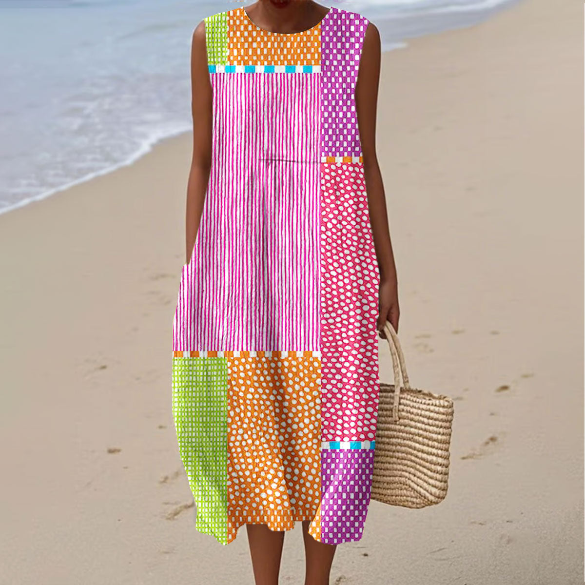 Women's Vintage Abstract Geometric Lines Art Print Sleeveless Cotton Pocket Wrap Dress