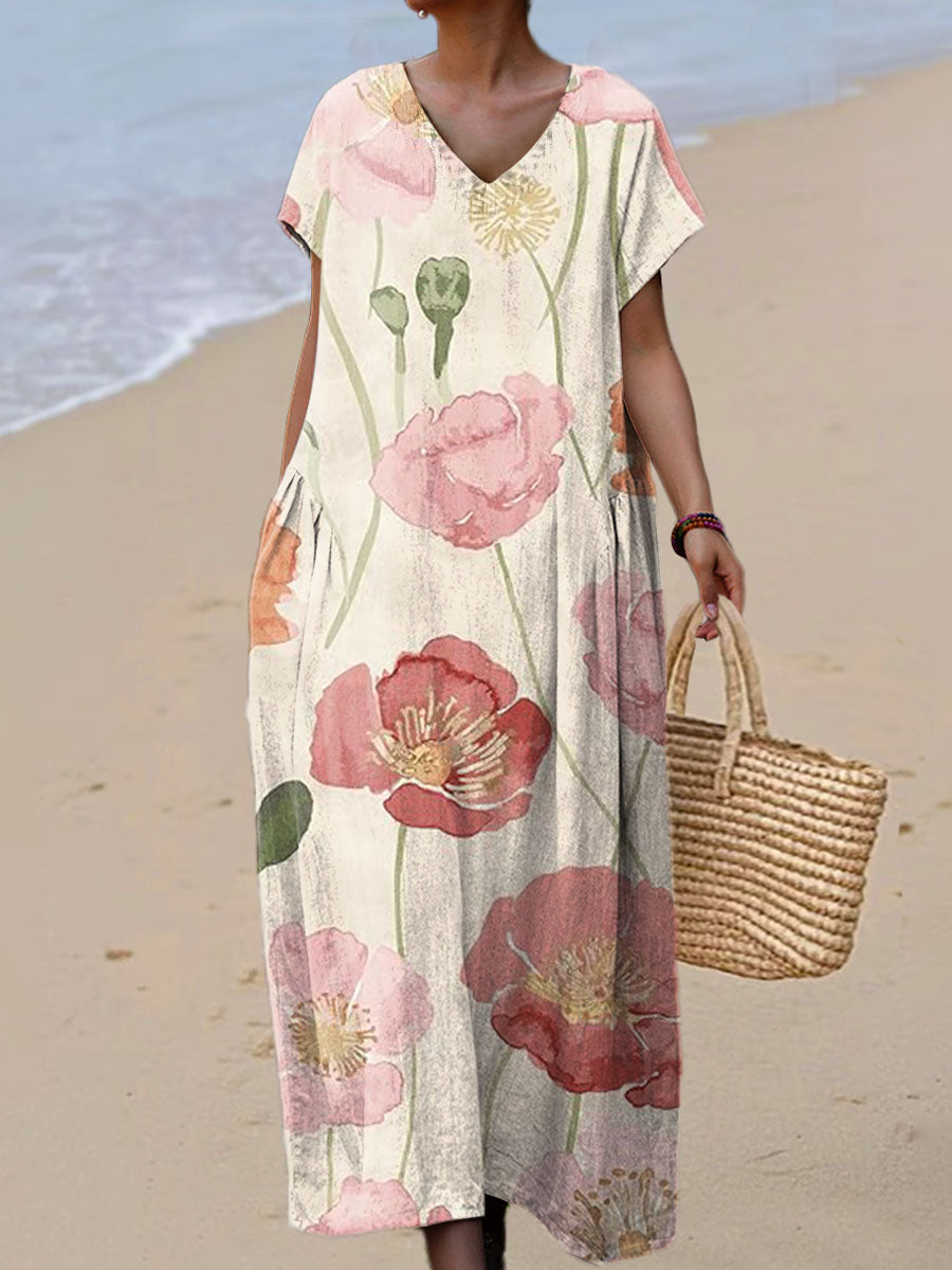 Women's Vintage Art Flower Print Linen And Cotton V-neck Dress