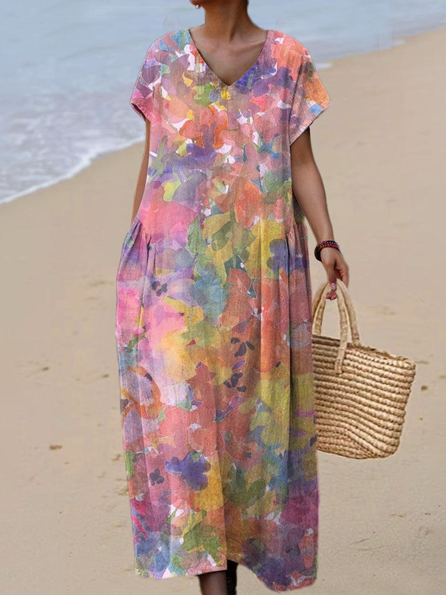 Women's Vintage Art Oil Painting Abstract Flower Print Linen And Cotton V-neck Dress