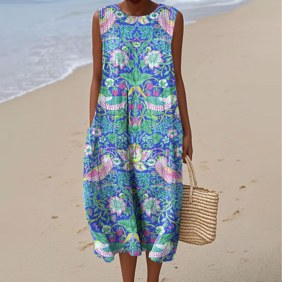 Women's Vintage Bird and Floral Art Print Sleeveless Cotton Pocket Wrap Dress