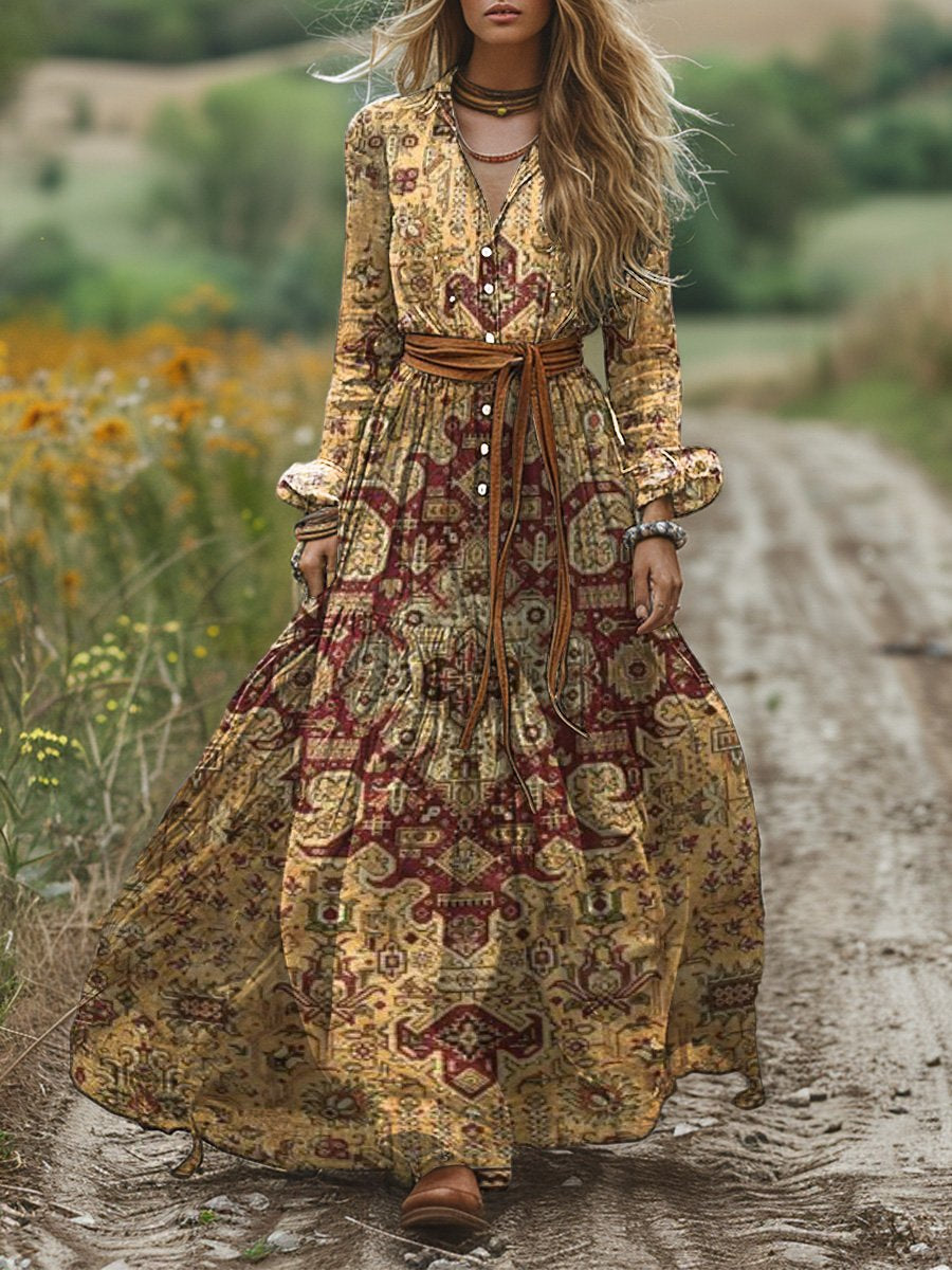 Women's Vintage Ethnic Art Patterns Print Pocket Cotton Maxi Dress