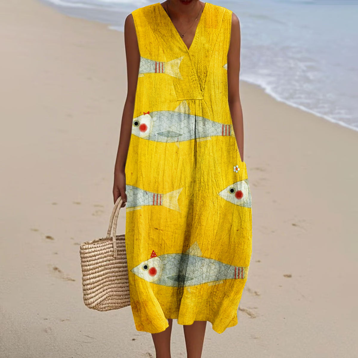 Women's Vintage Fish Sardines Art Print Sleeveless Cotton Pocket Wrap V Neck Dress