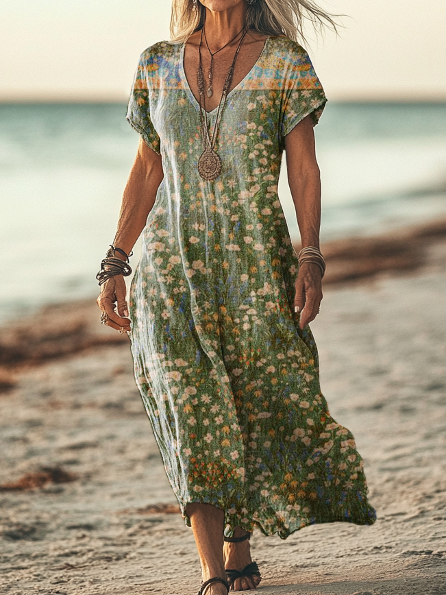 Women's Vintage Floral Art Print Pocket Cotton Dress