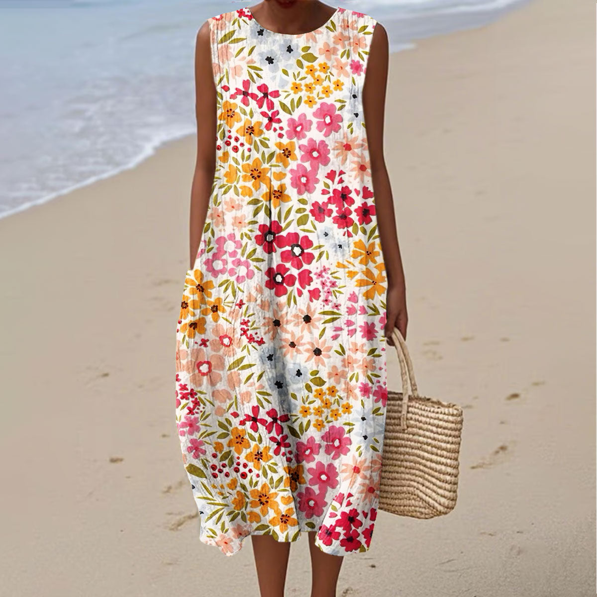 Women's Vintage Floral Art Print Sleeveless Cotton Pocket Wrap Dress