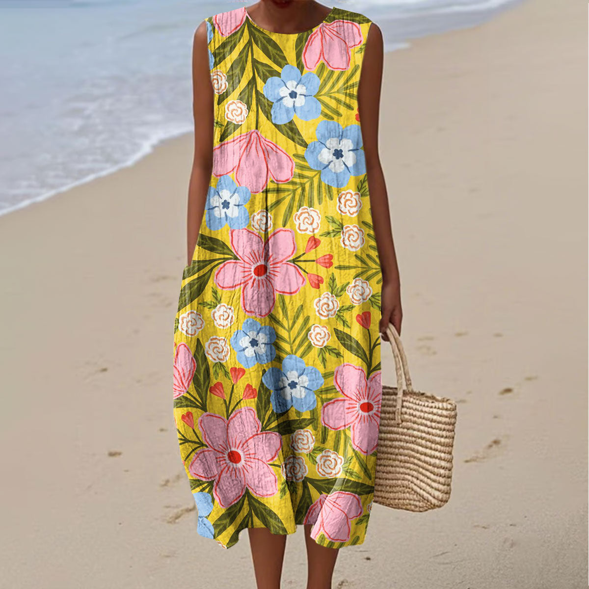 Women's Vintage Floral Art Print Sleeveless Cotton Pocket Wrap Dress