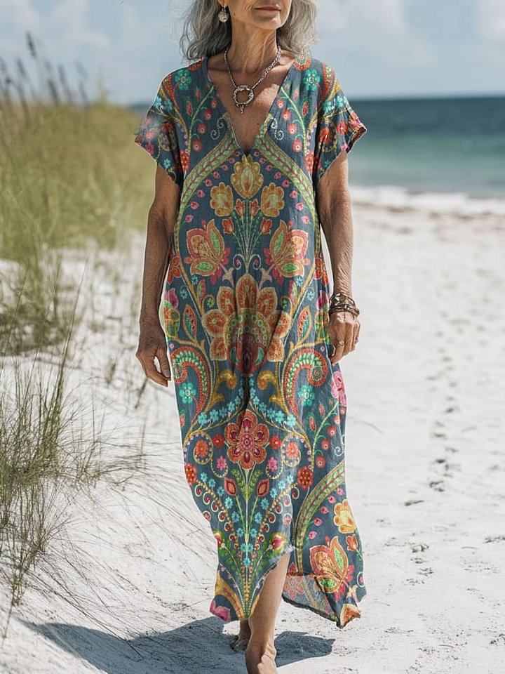 Women's Vintage Floral Colorful Art Print Pocket Cotton Dress