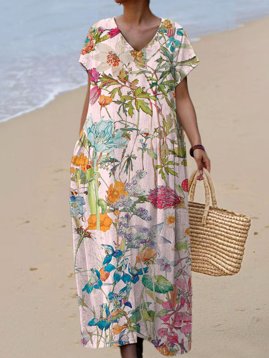 Women's Vintage Flower Art Print Linen And Cotton V-neck Dress
