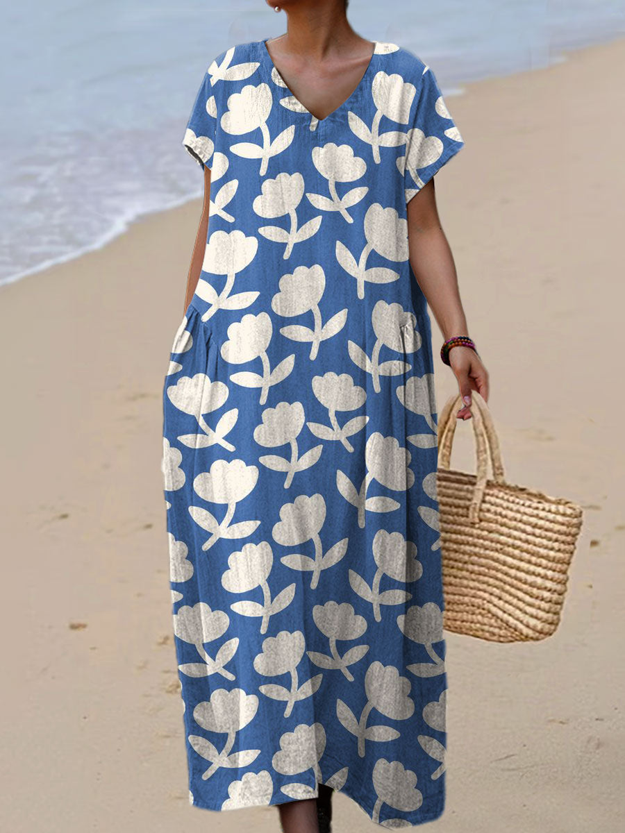 Women's Vintage Flower Art Print Linen And Cotton V-neck Dress