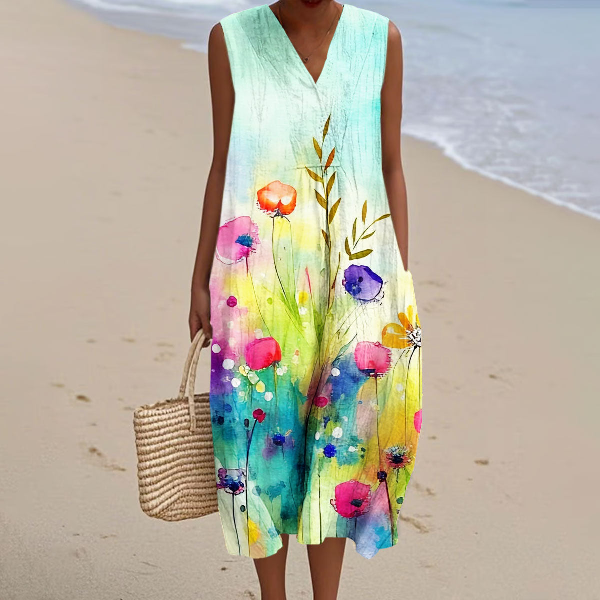 Women's Vintage Flower Art Print Sleeveless Cotton Pocket Wrap V Neck Dress