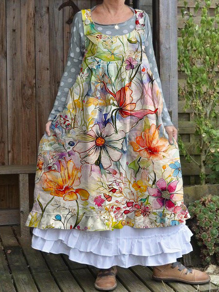 Women's Vintage Lovely Floral Art Print Sleeveless Cotton Pocket Wrap Dress