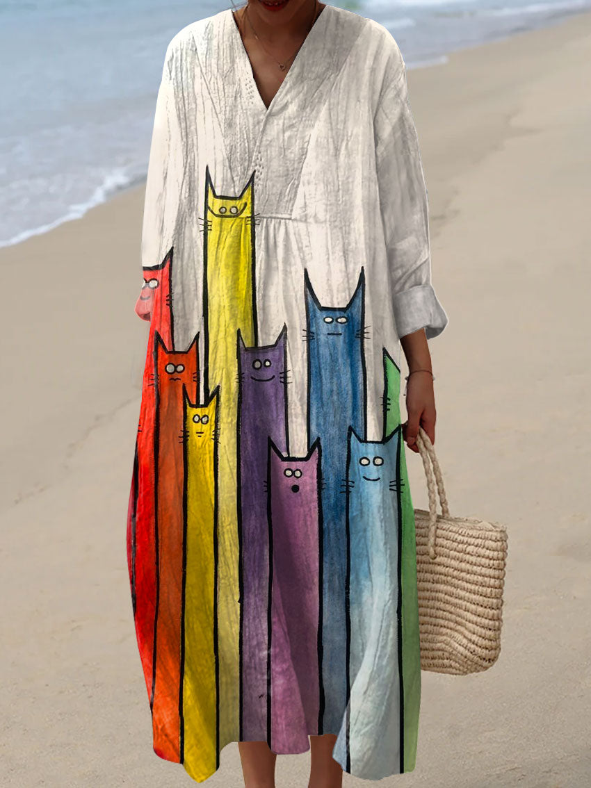 Women's Vintage Rainbow Cat Art Print Casual Dress